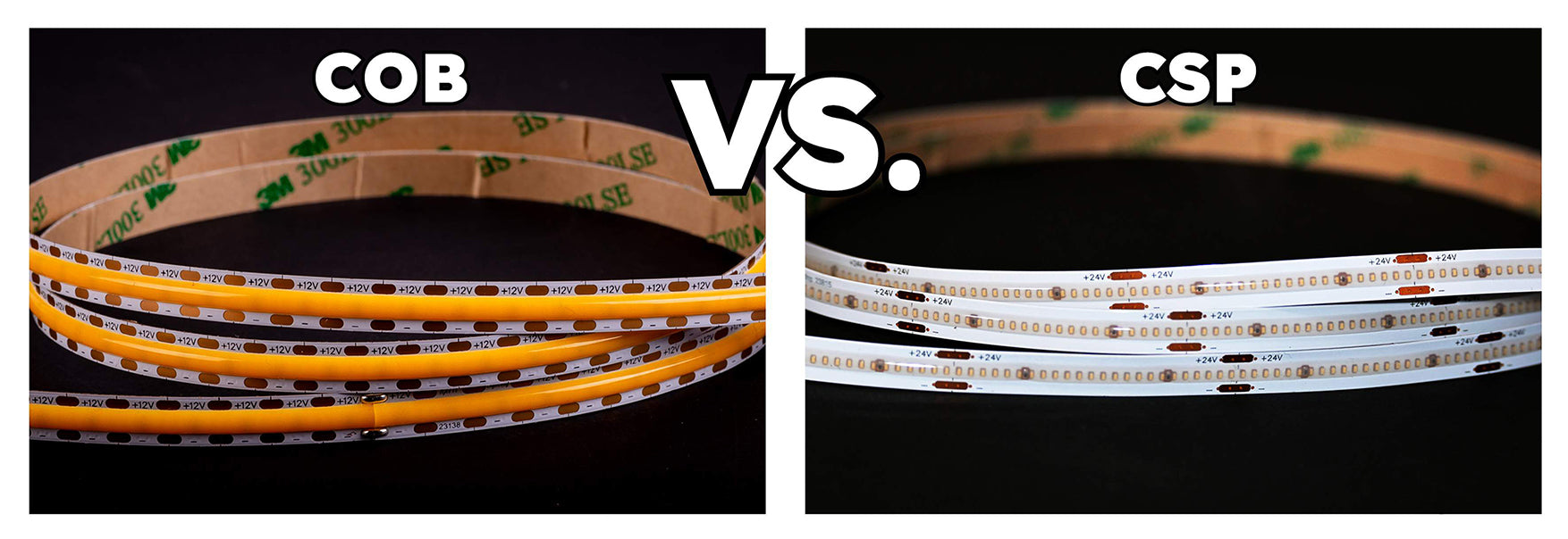 Both COB and CSP LED strips provide high-quality lighting but differ in design and effects. COB strips deliver a continuous, bright light with great color rendering, while CSP strips offer a minimalist, dotless light for modern aesthetics.